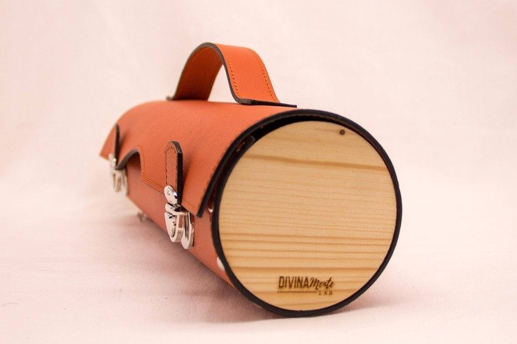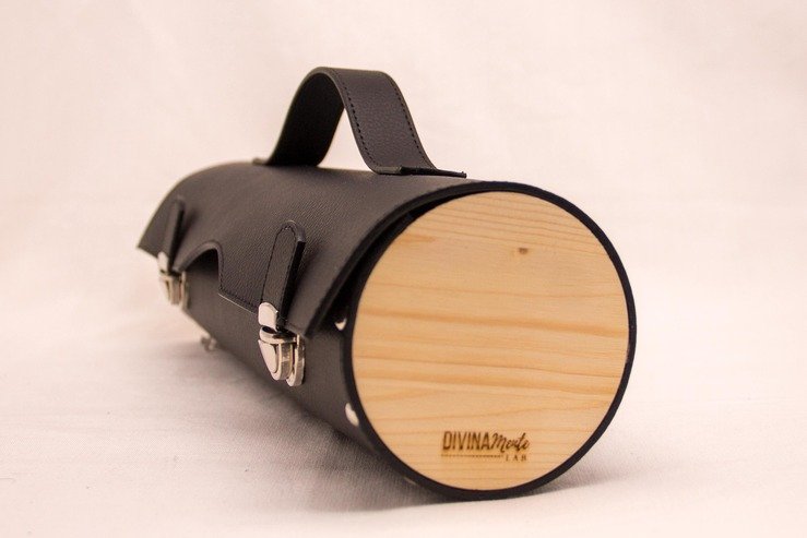 Portabottiglia in ecopelle nautica con laterale di legno di abete, due chiusure a cartella, per contenere bottiglie di vino alte massimo 31cm e 8cm di diametro (tipo Bordolese)