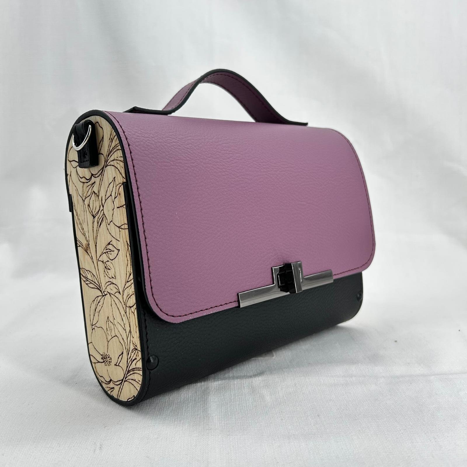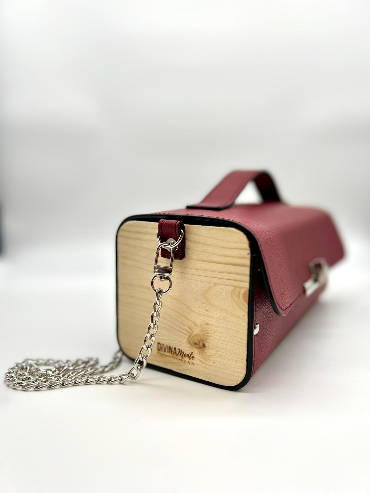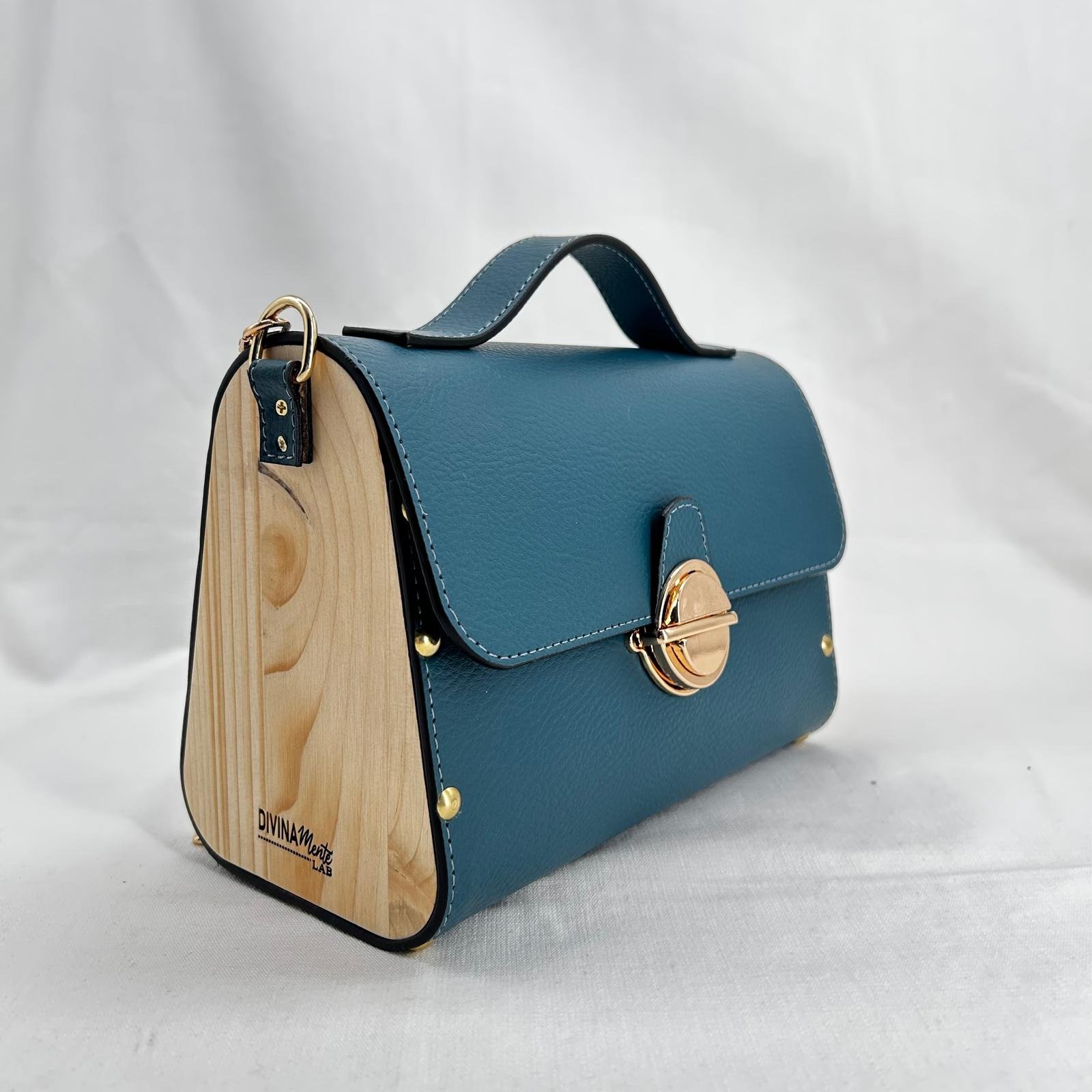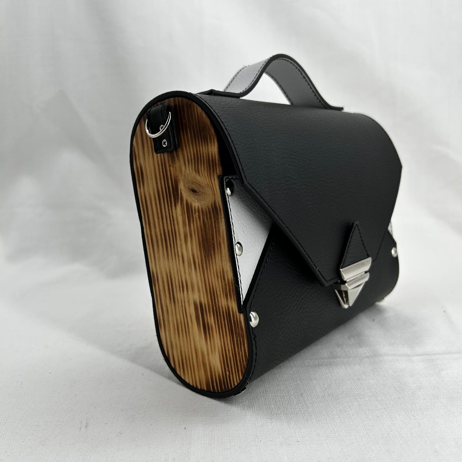 Borsa in ecopelle con latertali in legno di abete massello, chiusura a cartella, tracolla in metallo dorato. Misure *25cm*9cm*9cm