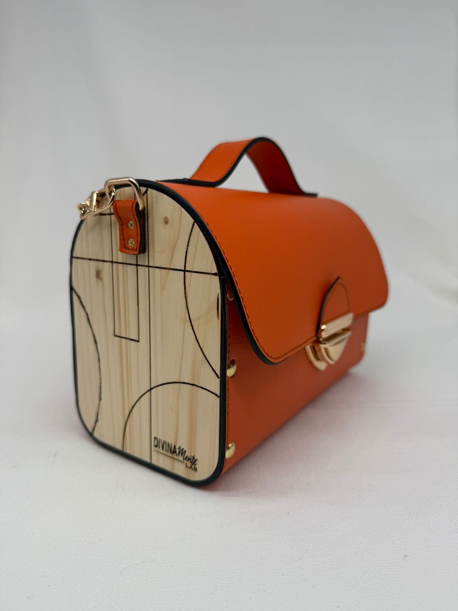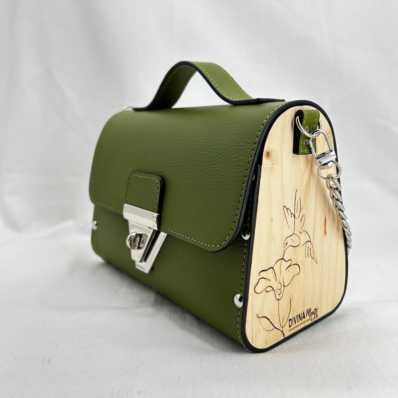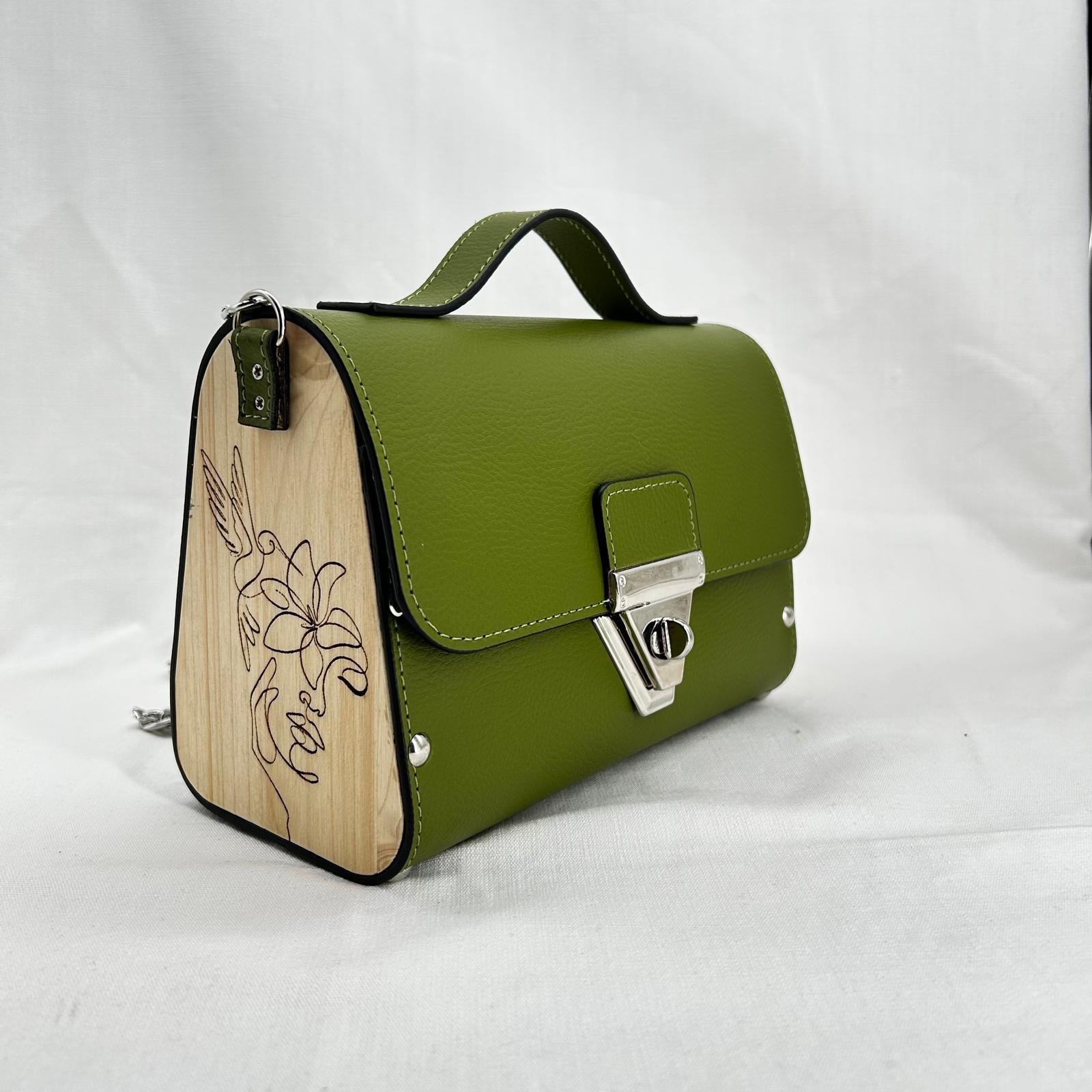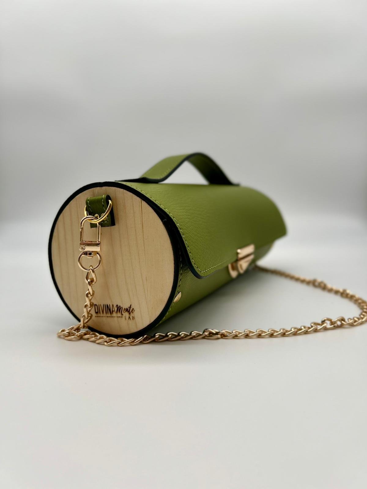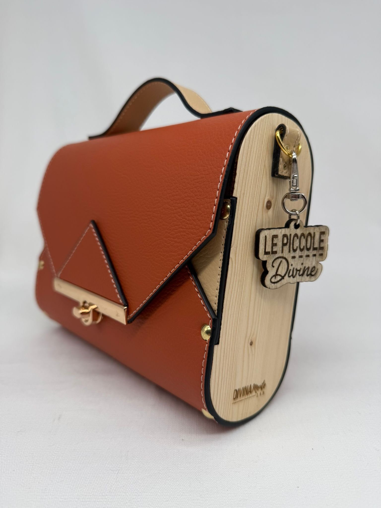 Borsa in ecopelle con latertali in legno di abete massello, chiusura a cartella, tracolla in metallo dorato. Misure *25cm*9cm*9cm