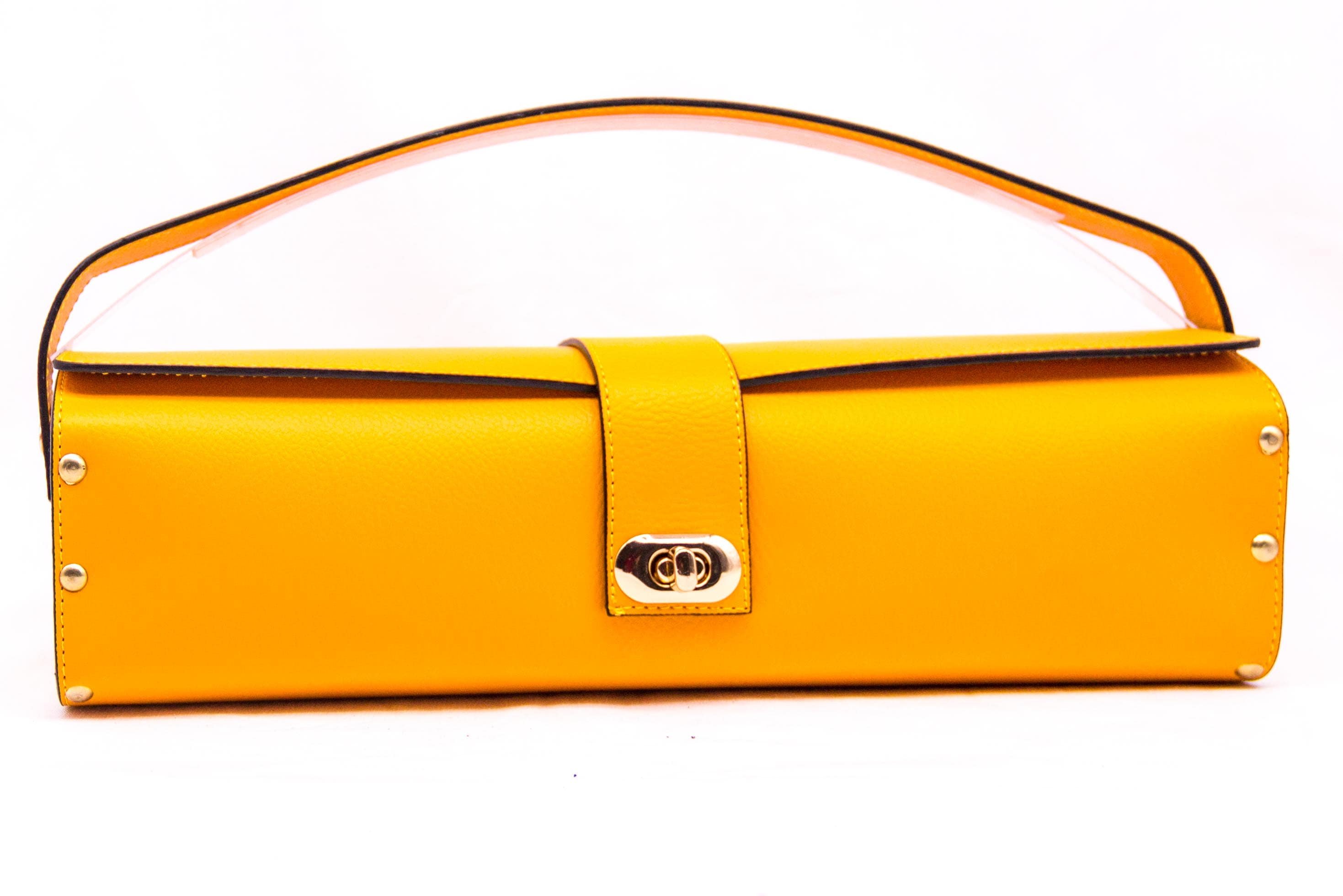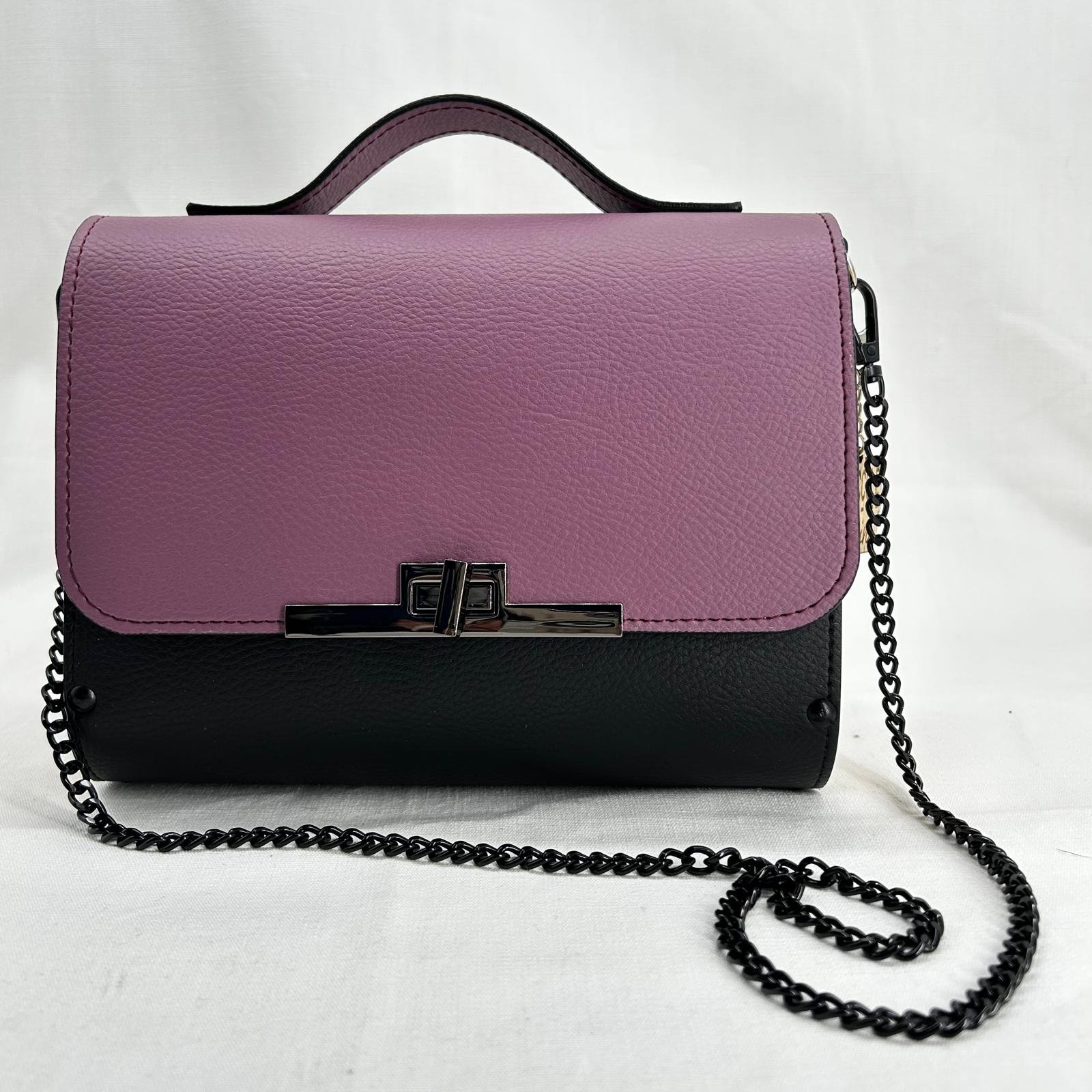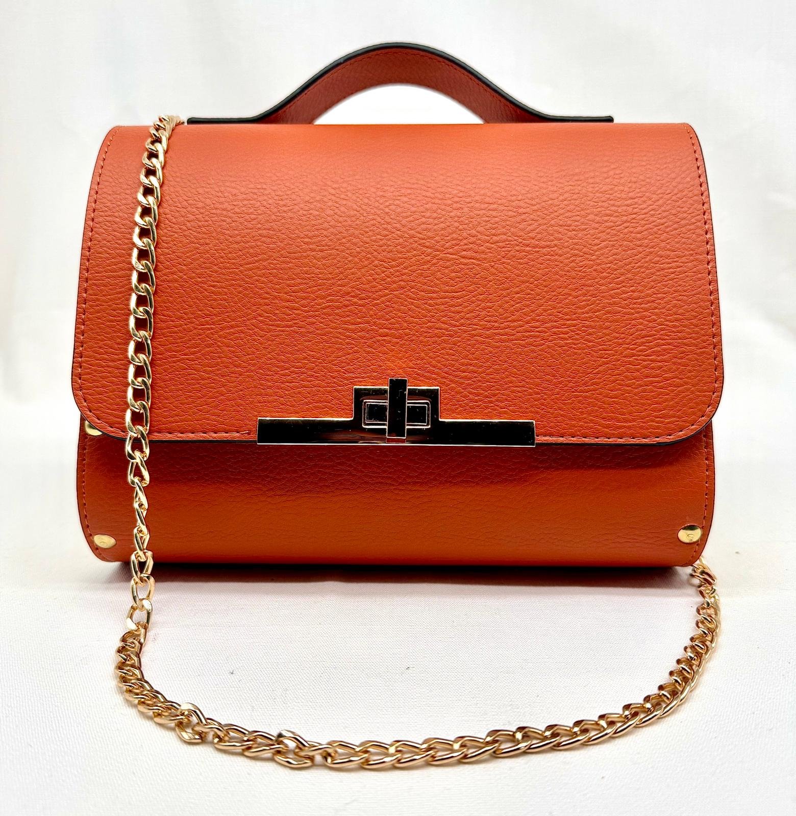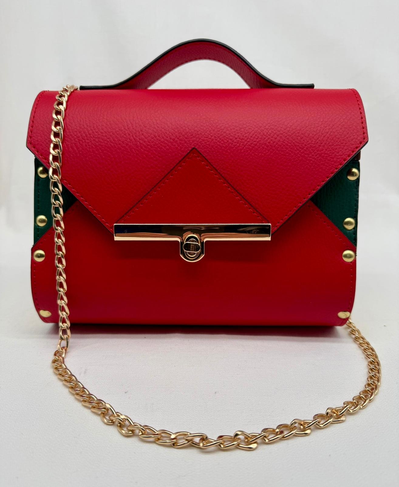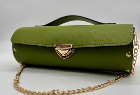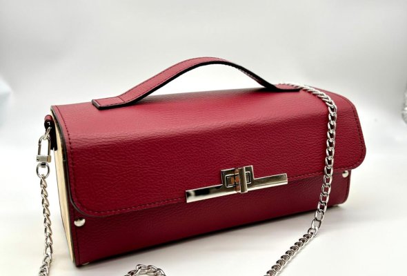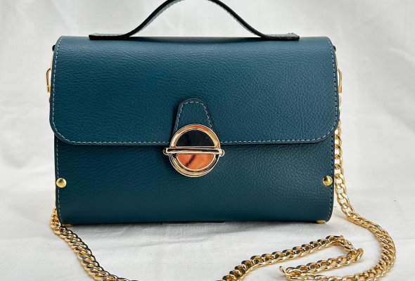 Borsa in ecopelle con latertali in legno di abete massello, chiusura a cartella, tracolla in metallo dorato. Misure *25cm*9cm*9cm