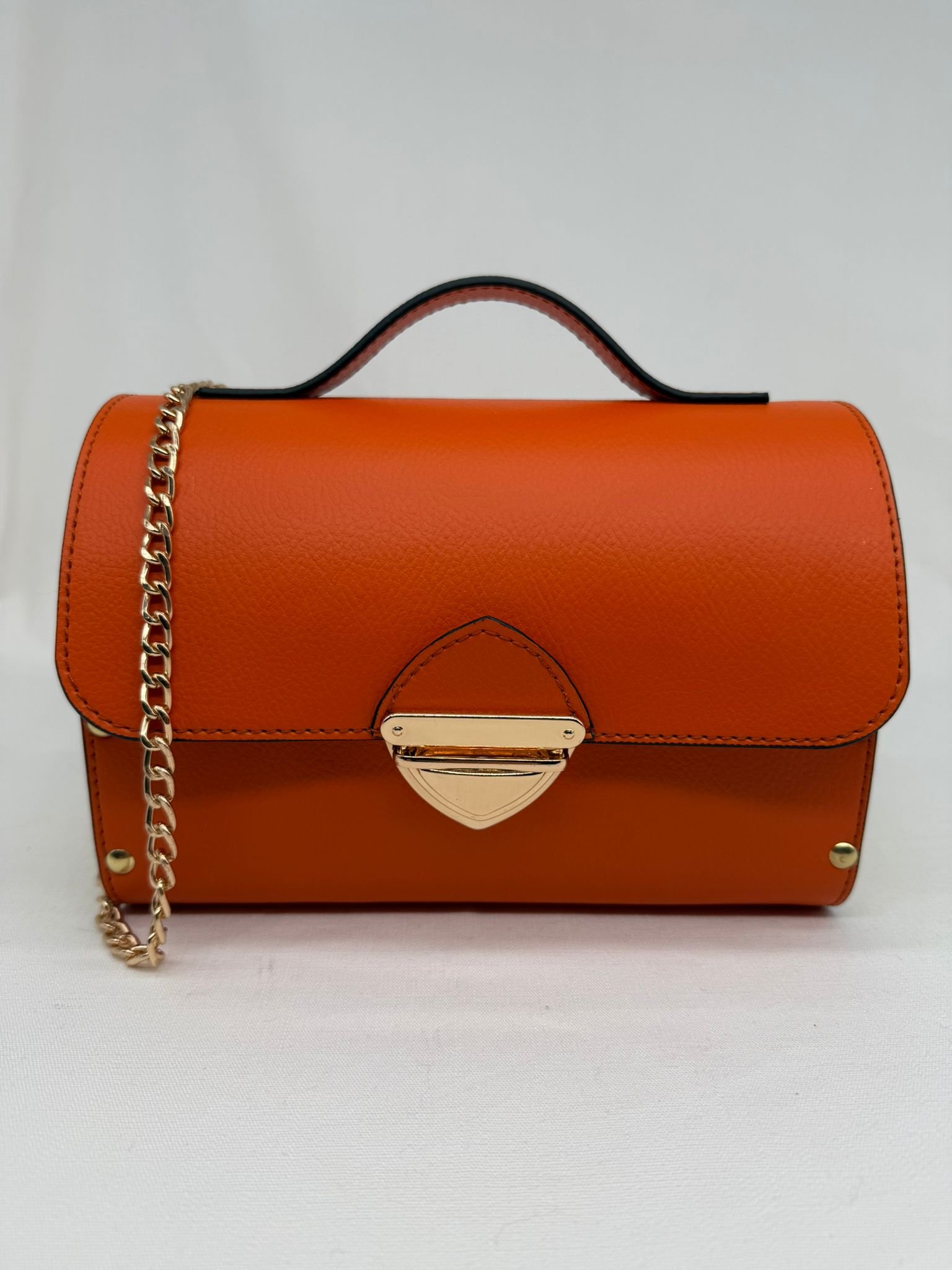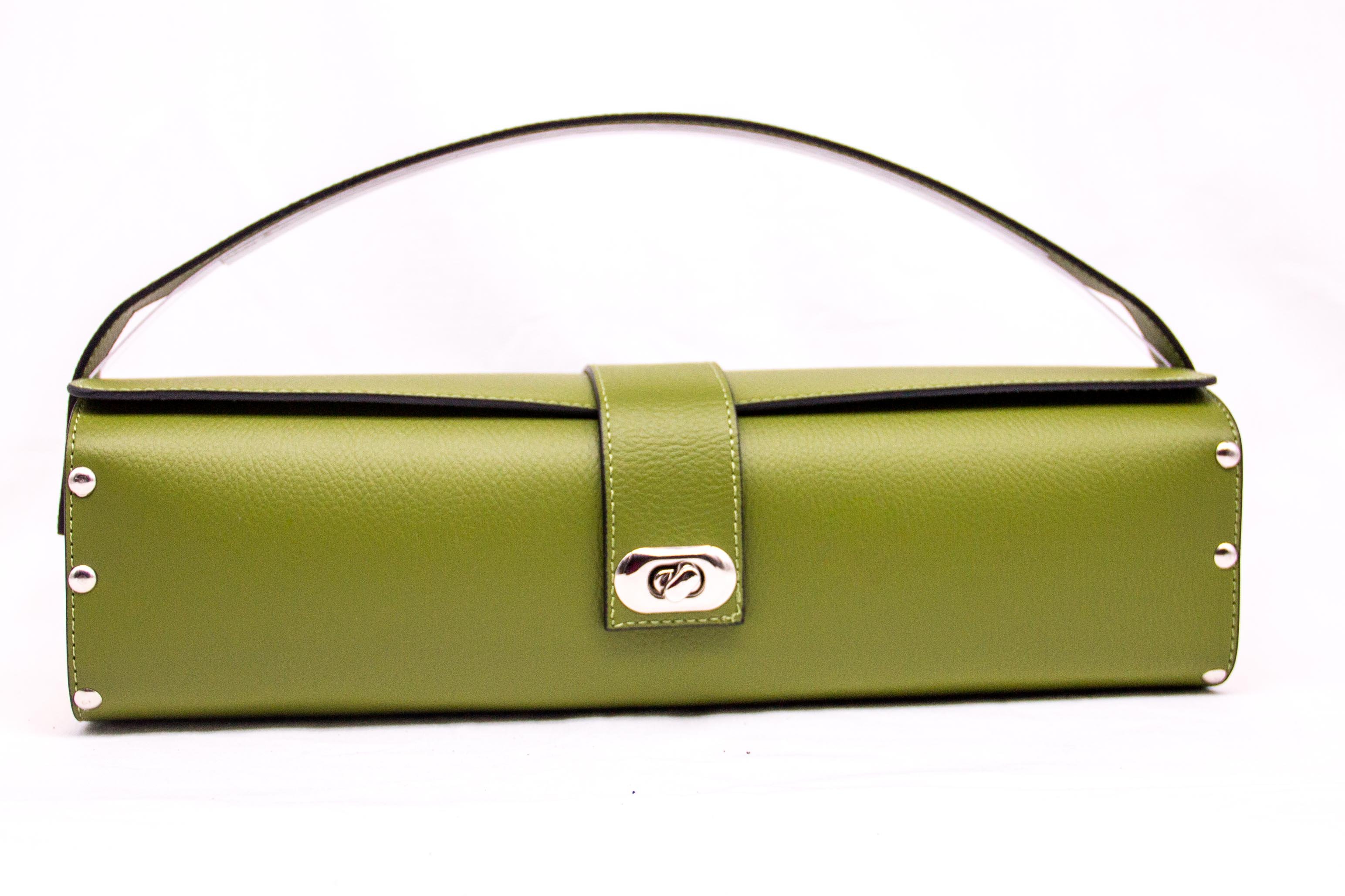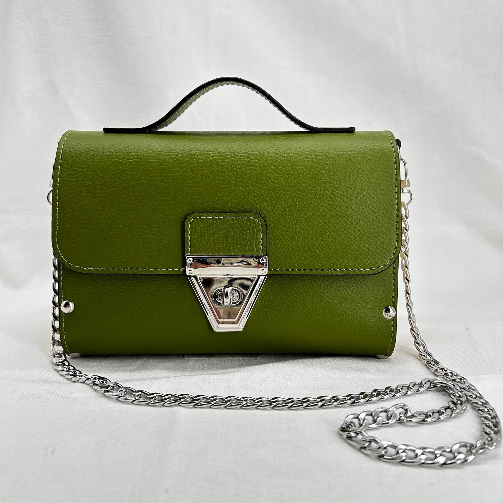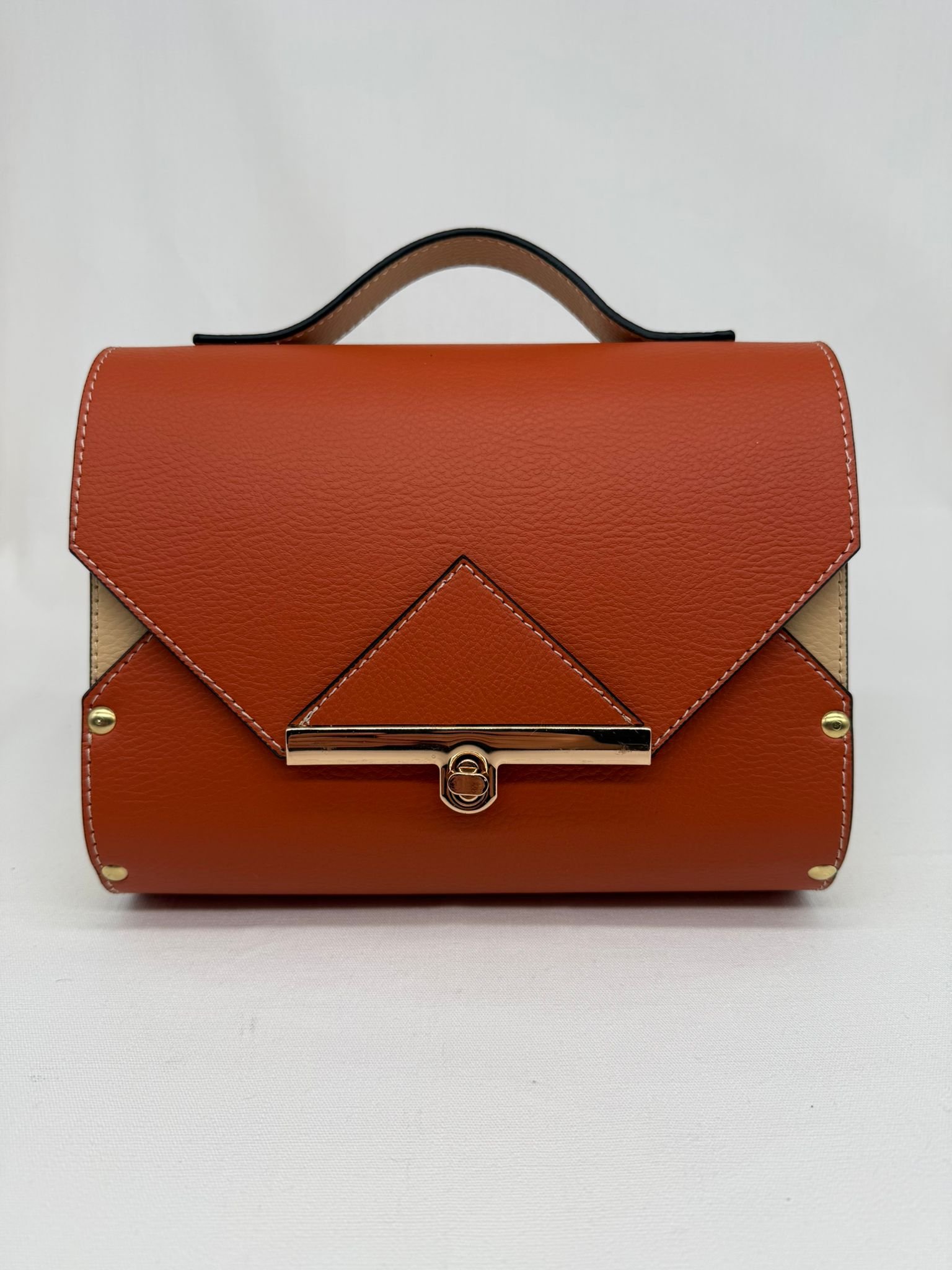 Borsa in ecopelle con latertali in legno di abete massello, chiusura a cartella, tracolla in metallo dorato. Misure *25cm*9cm*9cm