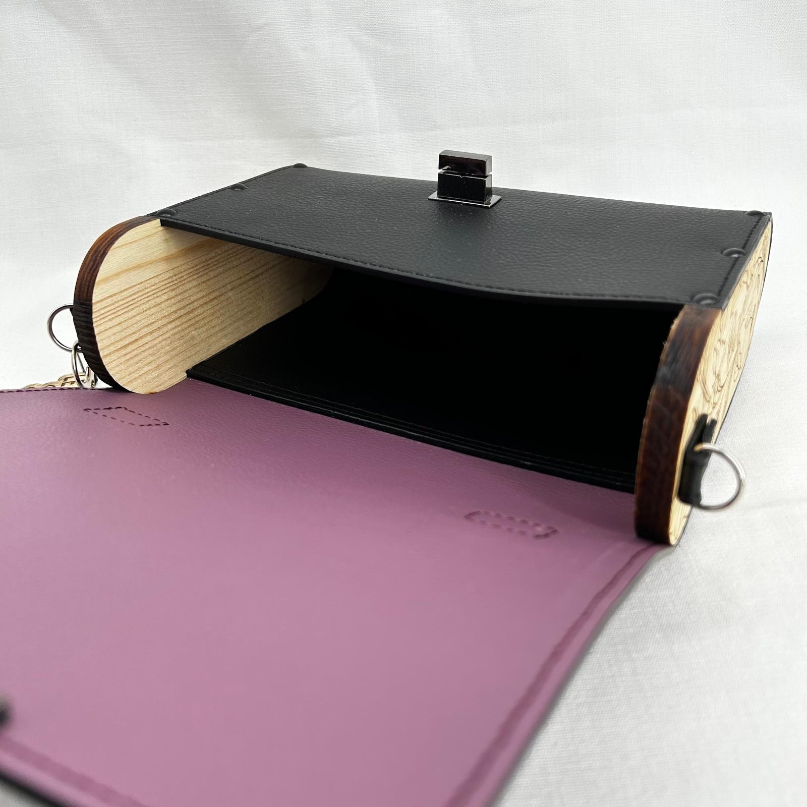 borsa in ecopelle con laterali in abete massello inciso con motivi geometrici, chiusura a cartella e tracolla in metallo doratp