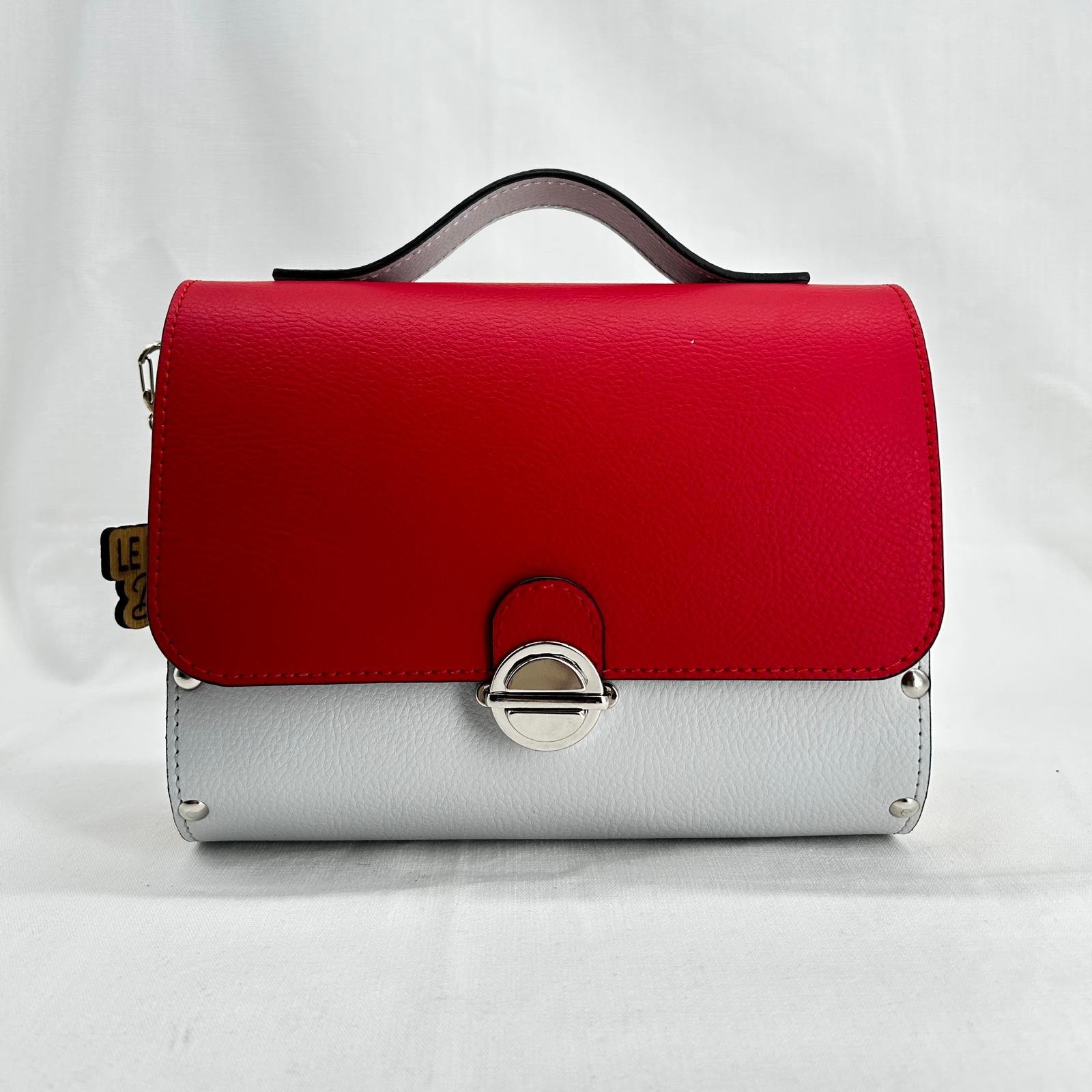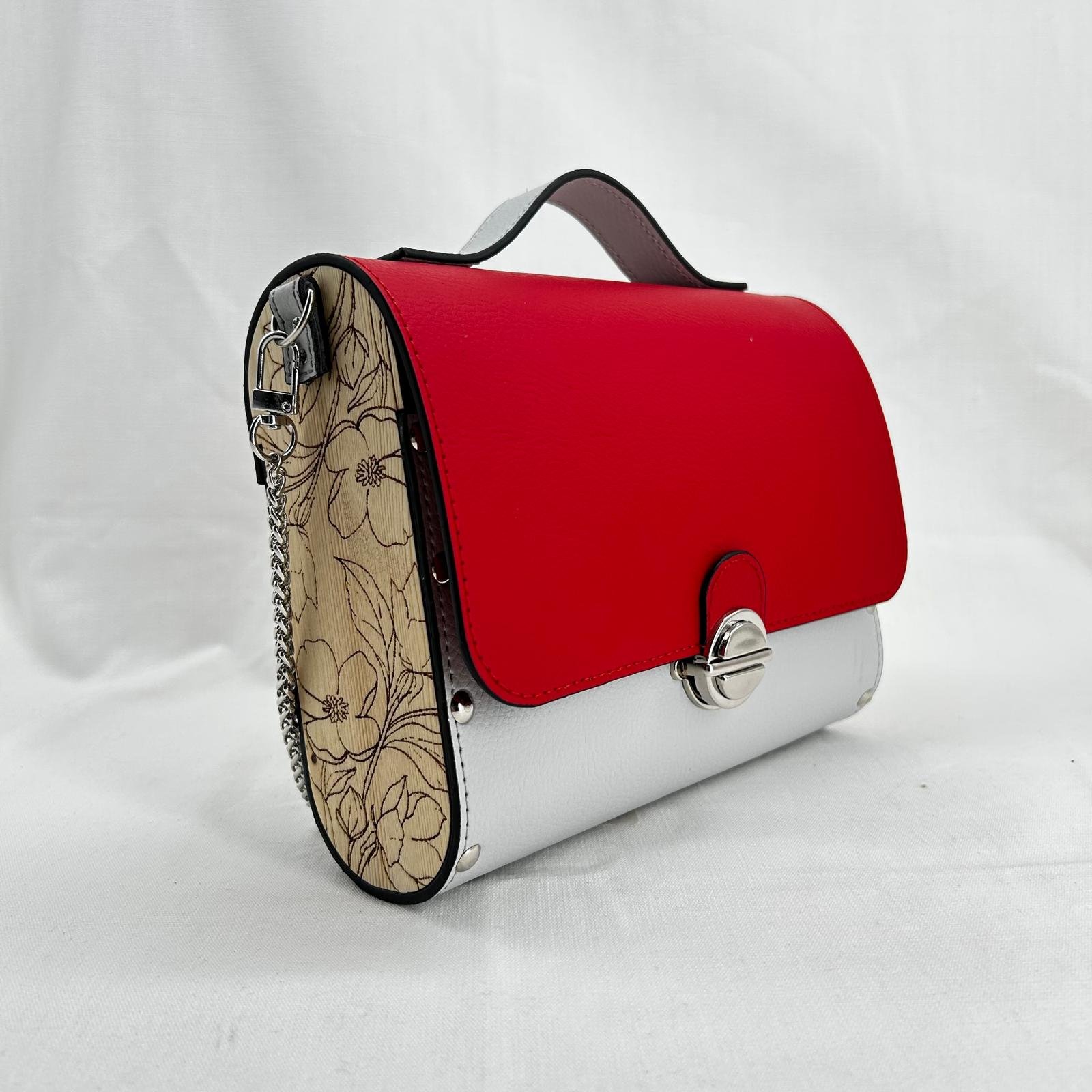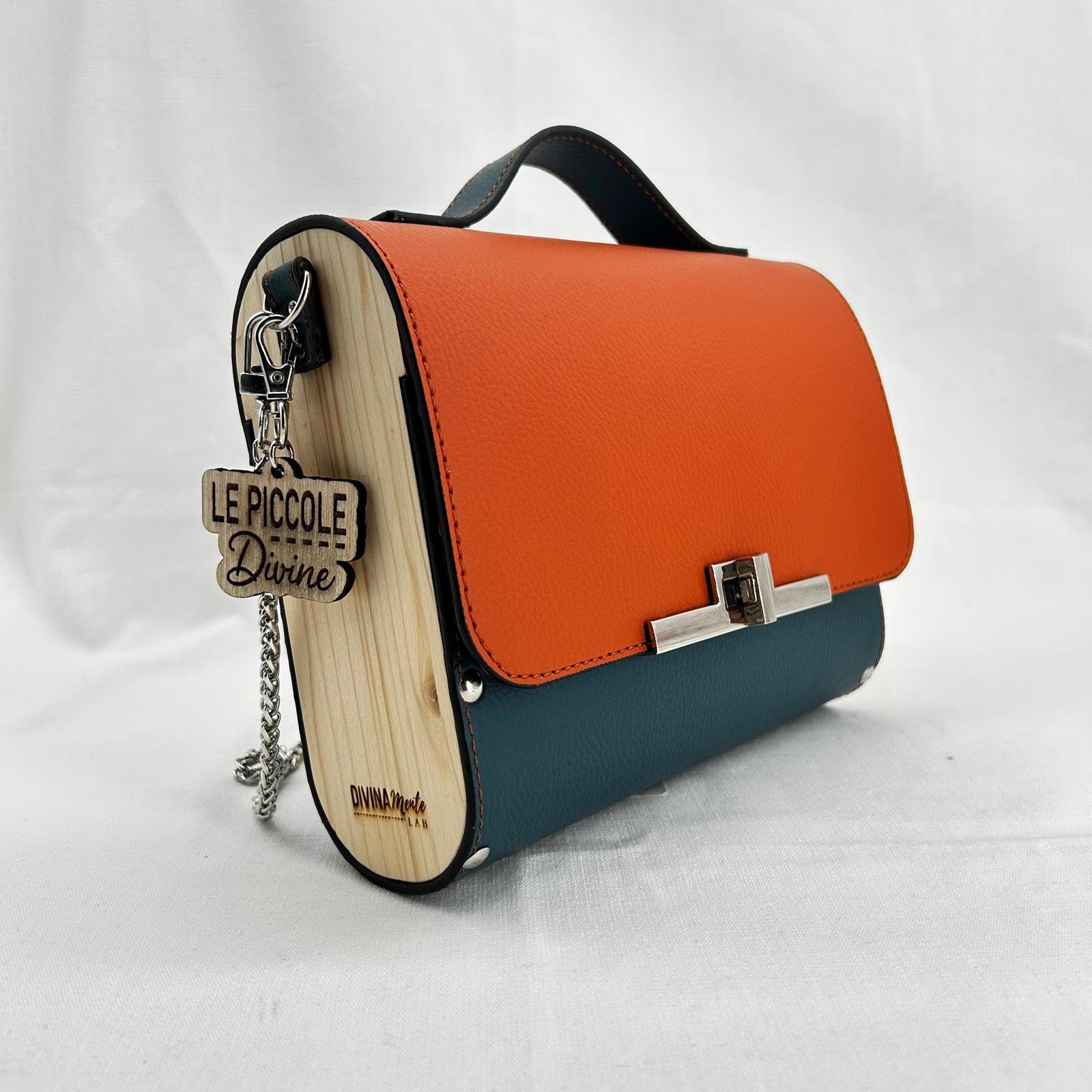 Borsa in ecopelle nautica bicolore con laterali in legno di abete massello.Chiusura e tracolla in metallo canna di fucile. Misure: 21cm*16cm*5cm