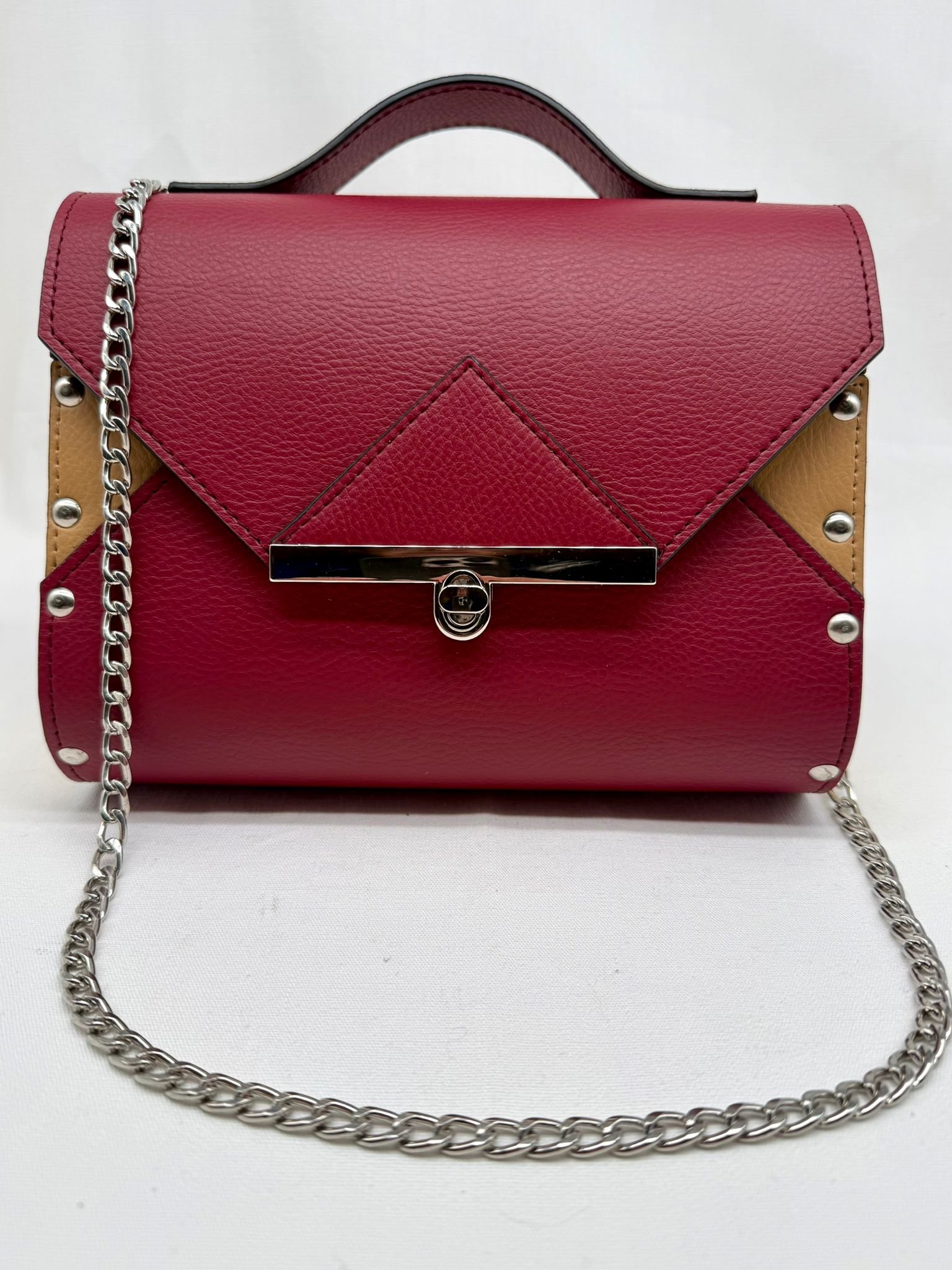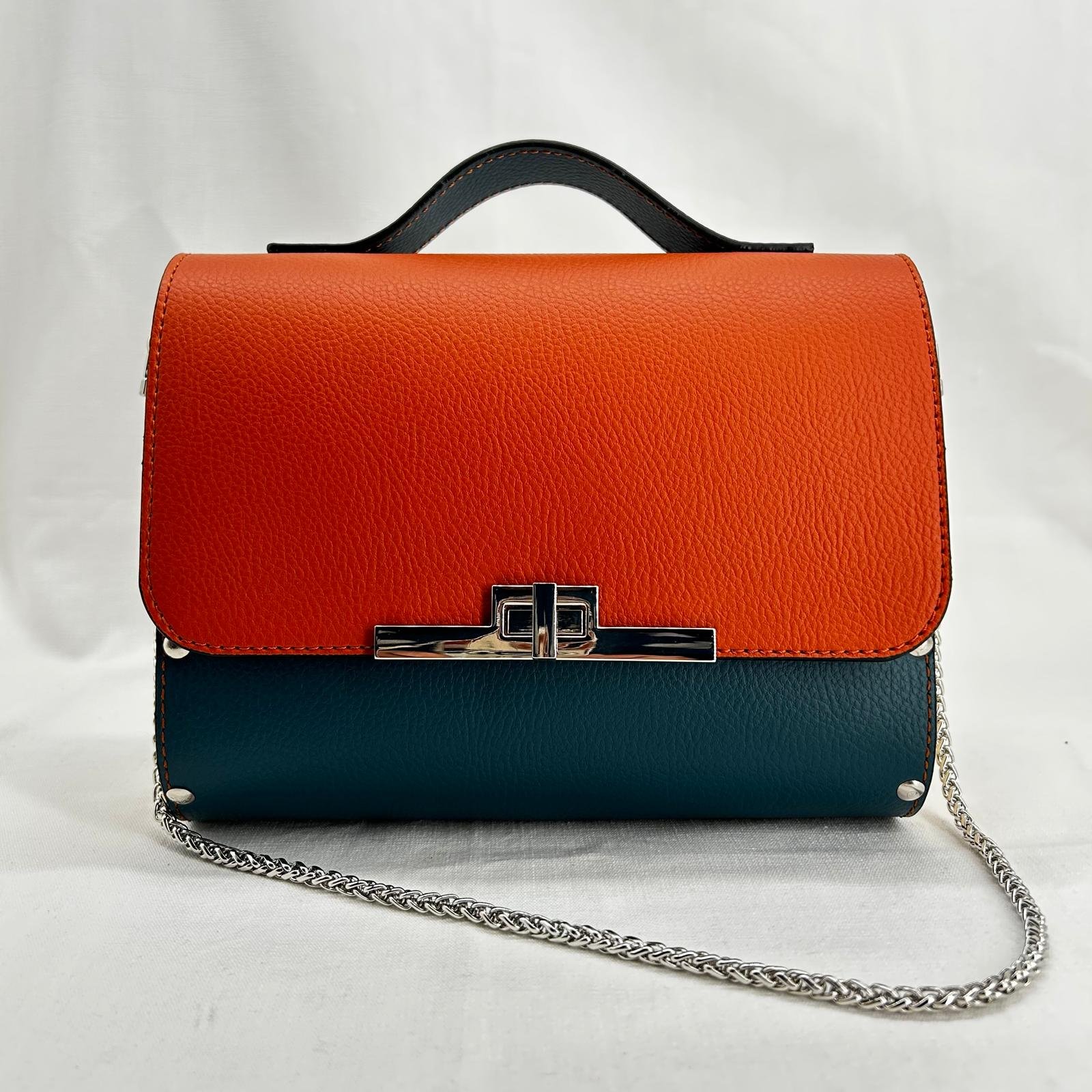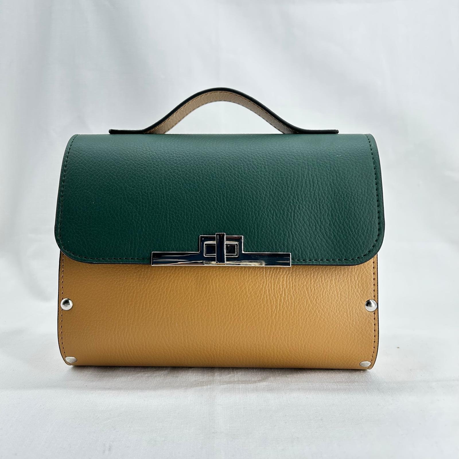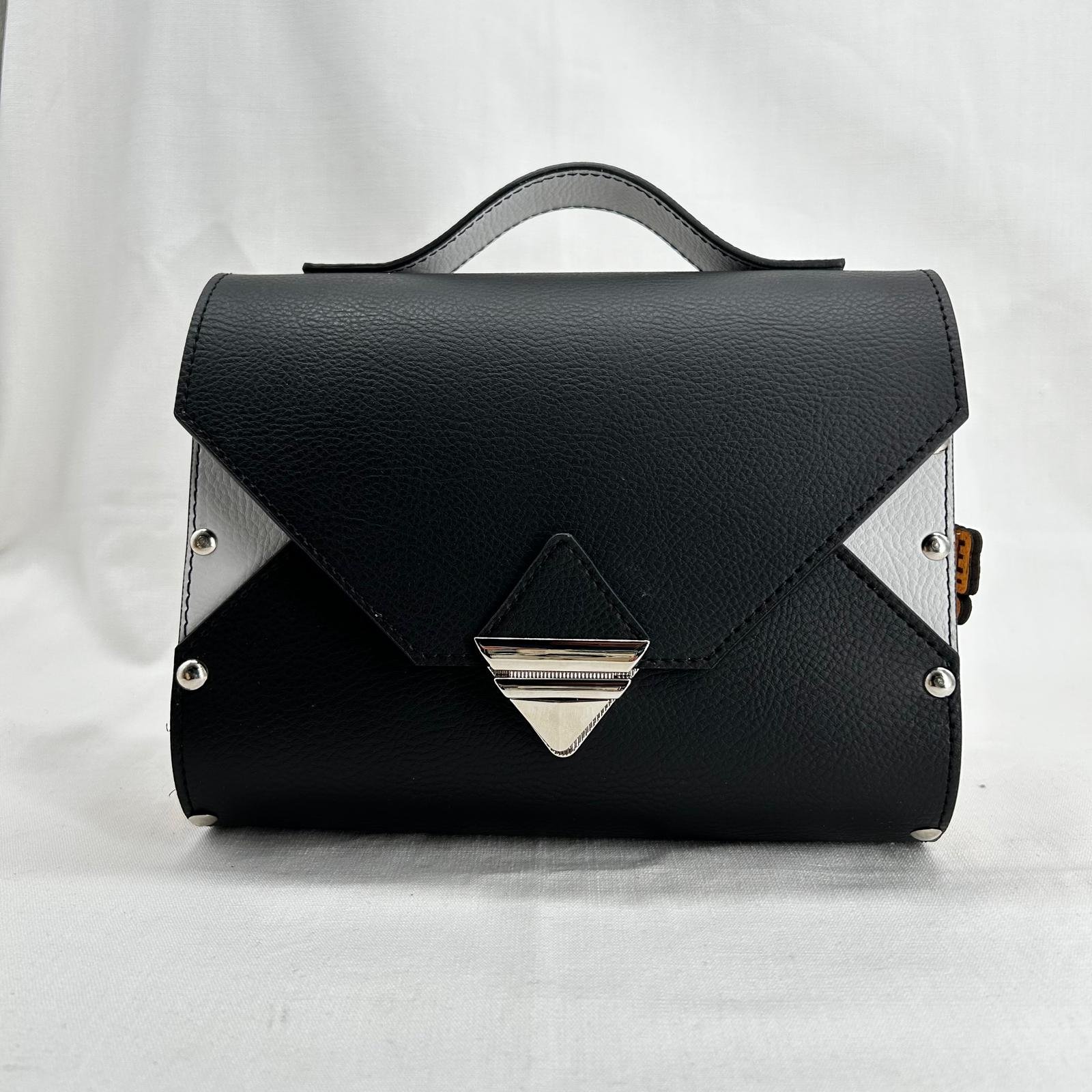 Borsa in ecopelle nautica bicolore con laterali in legno di abete massello.Chiusura e tracolla in metallo canna di fucile. Misure: 21cm*16cm*5cm